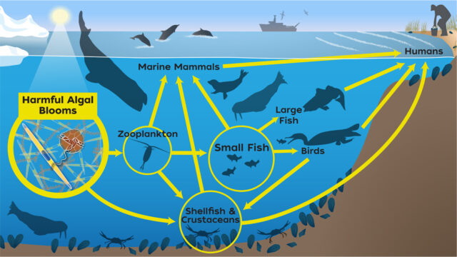 Toxins from HABs accumulate via the food web, potentially affecting all aquatic organisms and humans consuming aquatic organisms. Figure from Anderson et al. (2022): https://doi.org/10.5670/oceanog.2022.121. Reproduced under Creative Commons 4.0.